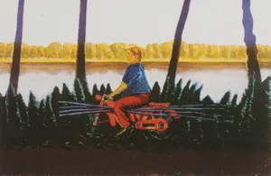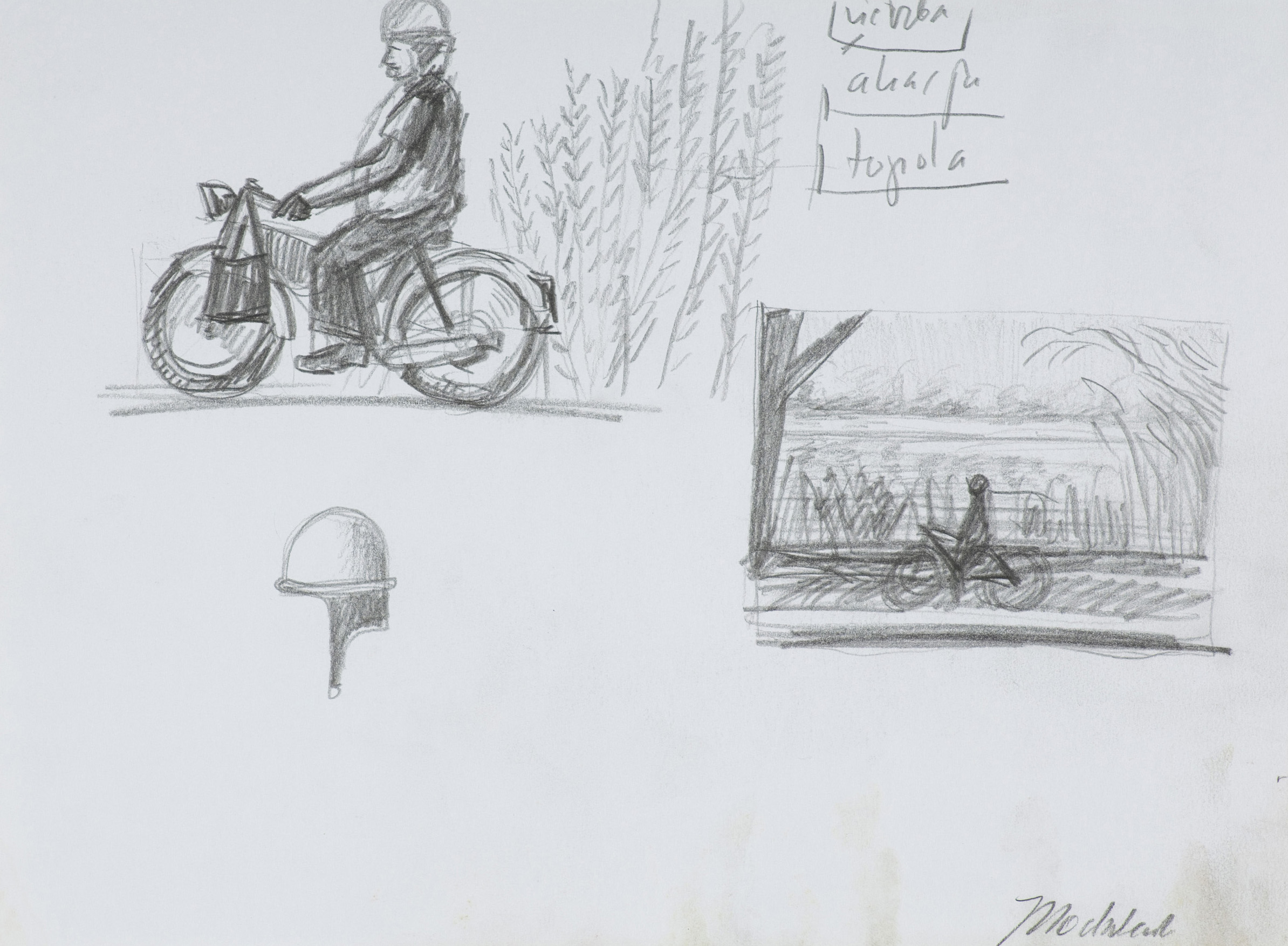 Jarosław Modzelewski (Warszawa 1955, mieszka w Warszawie) studiował malarstwo w ASP w Warszawie w latach 1975-1980, uzyskując dyplom w pracowni Stefana Gierowskiego. Od 1982 pracuje jako pedagog na macierzystym wydziale. W 1982 był współzałożycielem „Gruppy”, najważniejszego ugrupowania nurtu nowej ekspresji lat 80., działającego do 1992. W latach 1991-1996 wspólnie z Markiem Sobczykiem prowadził prywatną Szkołę Sztuki w Warszawie. Od wielu lat współpracuje z Galerią Zderzak w Krakowie. W początkowym okresie twórczości skłaniał się ku abstrakcji, wykorzystywał uproszczone znaki i emblematy oraz sylwetki odbite z szablonu. W 1985 namalował cykl oparty na ilustracjach do podręczników języka rosyjskiego, obrazujący proste czynności, których czasownikowe określenia stanowią tytuły prac. W 1986-1989 powstawały obrazy utrzymane w konwencji realistycznej, jednak zarazem o surrealnej atmosferze uzyskiwanej różnymi metodami, np. przez dublowanie figur, ukazywanie postaci w sytuacji niepewności czy zagrożenia, zabiegi z przestrzenią. W grupie obrazów z 1988 artysta rezygnuje z postaci ludzkiej na rzecz wyjątkowego nasycenia emocją samej przestrzeni pejzaży i wnętrz. Około 1990 wraca do kompozycji akcentujących czynności wykonywane przez postaci, które często umieszczone są w pustej, zaledwie zasugerowanej, acz dominującej przestrzeni. Odrealnienia i monumentalności dodaje tym obrazom płaskie i rozległe kładzenie koloru.