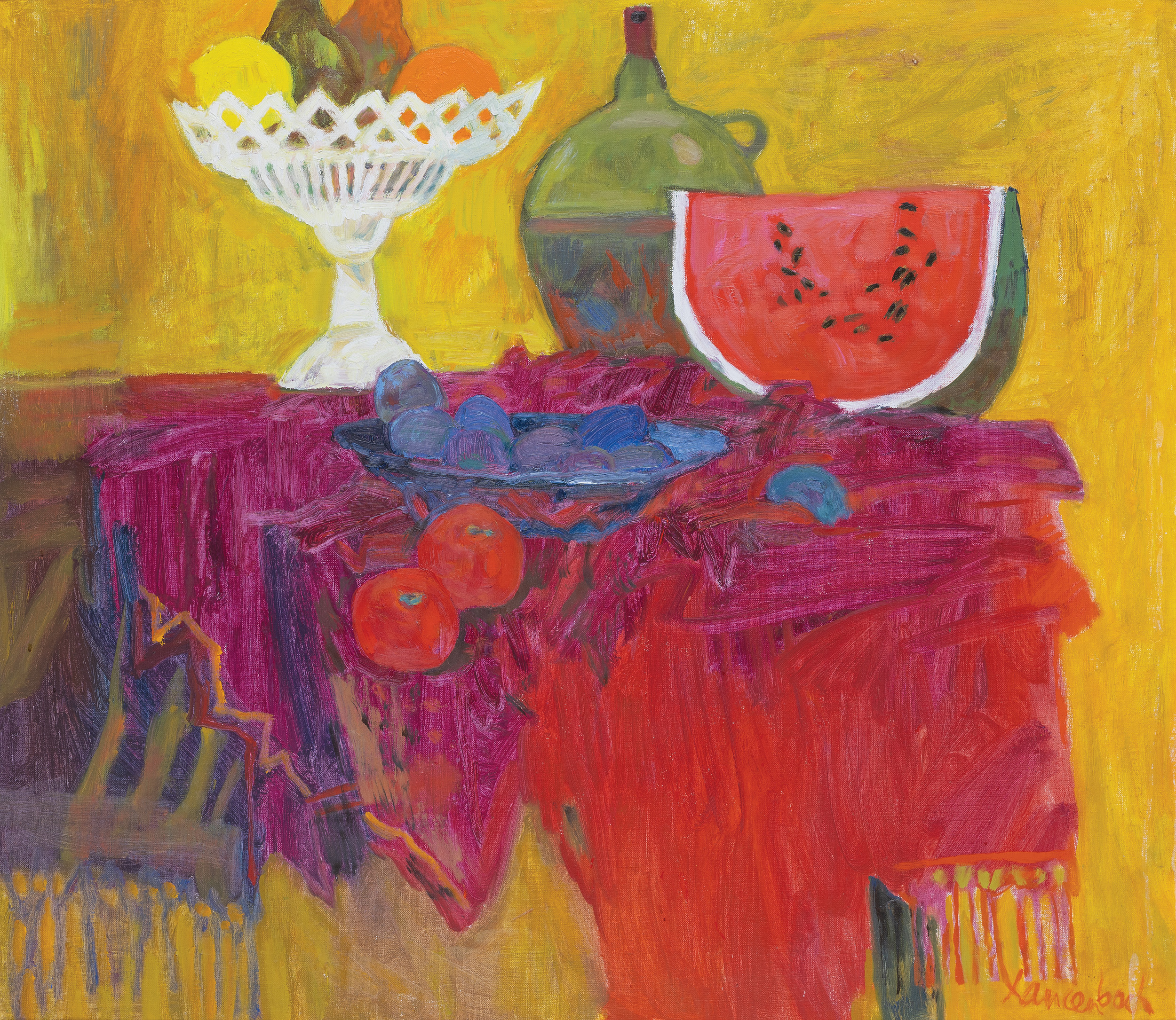 Jan Szancenbach (Kraków 1928 - Kraków 1998) studiował w latach 1940-1942 w Kunstgewerbeschule (czyli ASP zdegradowanej przez okupanta do roli szkoły zawodowej) pod kierunkiem m.in. Stanisława Kamockiego, Józefa Mehoffera, Andrzeja Jurkiewicza. Po zamknięciu uczelni, w latach 1942-1945 pracował zarobkowo i samodzielnie studiował. W 1945 został przyjęty ponownie na II rok studiów, które ukończył pod kierunkiem Eugeniusza Eibischa w 1948 (dyplom uzyskał w 1952). Od 1948 pracował jako asystent w macierzystej pracowni oraz w pracowni liternictwa i projektowania graficznego Ludwika Gardowskiego. Przeszedł wszystkie szczeble kariery akademickiej, od asystenta do profesora zwyczajnego (od 1986). Od 1972 prowadził własną katedrę na Wydziale Malarstwa. W latach 1987-1993 przez dwie kadencje był rektorem ASP w Krakowie. Jako malarz pozostawał wierny szkole koloryzmu polskiego, którego zasady przyswoił sobie w trakcie studiów u Eibischa. Jego malarstwo jest pełne światła i nasyconych barw, radosne, wręcz feeryczne. Obok wybitnych walorów kolorystycznych (zwłaszcza w czerwieniach malarz osiągał niezwykłą skalę odmian i odcieni) nie stroni od dekoratywizmu, co razem składa się na hedonistyczny, beztroski wyraz. Znany przede wszystkim jako twórca martwych natur, pejzaży, scen w ogrodach, Szancenbach zajmował się również malarstwem monumentalnym. Pracował m. in. przy renowacji Teatru im. Słowackiego w Krakowie oraz widowni i plafonu Opery we Wrocławiu. Innym wątkiem jego sztuki było projektowanie graficzne (znaki firmowe, plakaty, okładki, opakowania, etykiety, znaczki pocztowe itp.), zajmował się również ilustracją książkową i filmem rysunkowym.