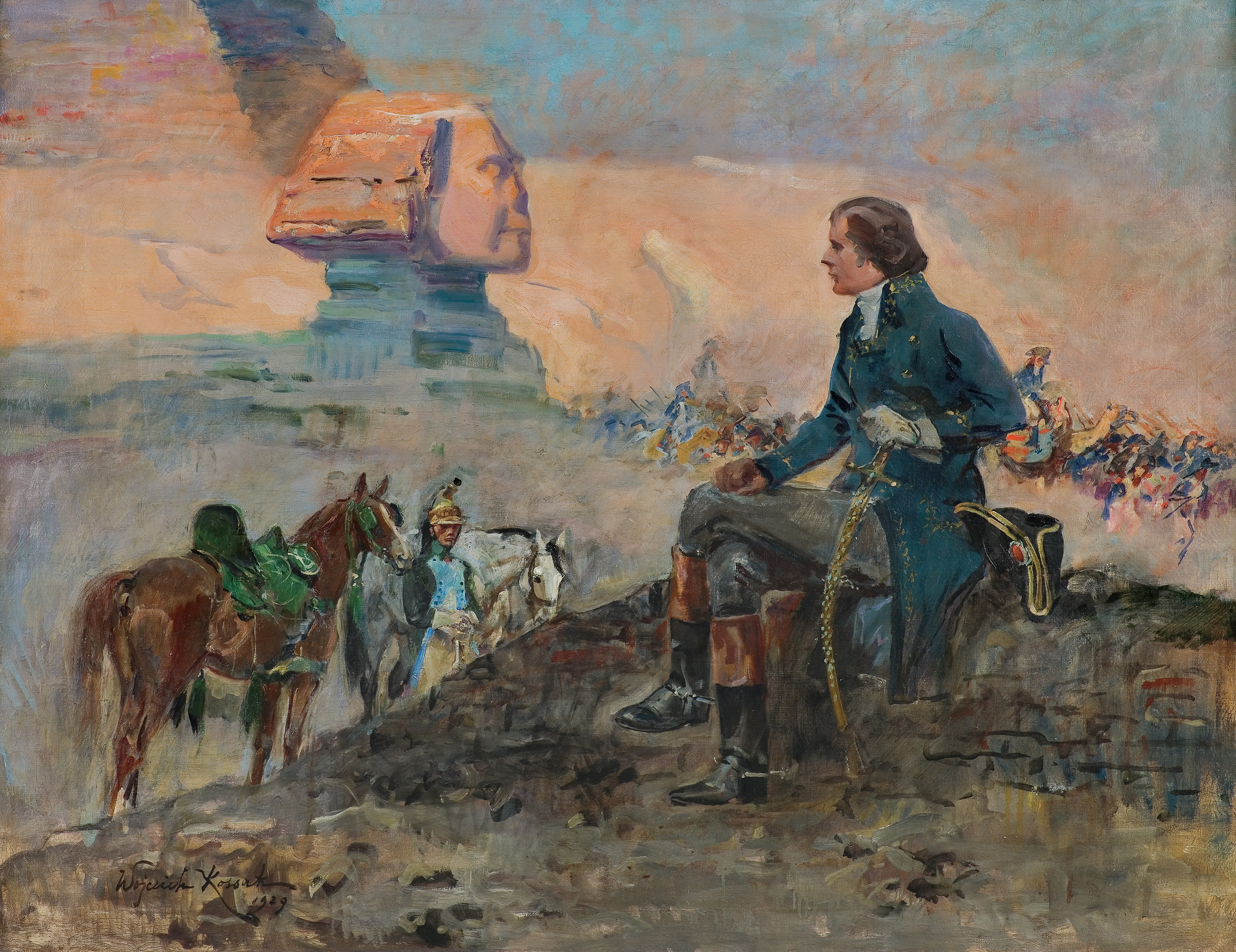 Napoleona i Sfinksa malował Wojciech Kossak kilkakrotnie, powtarzając ten motyw w nieznacznie różniących się wariantach kompozycyjnych. Sam pomysł tej kompozycji wyd...
