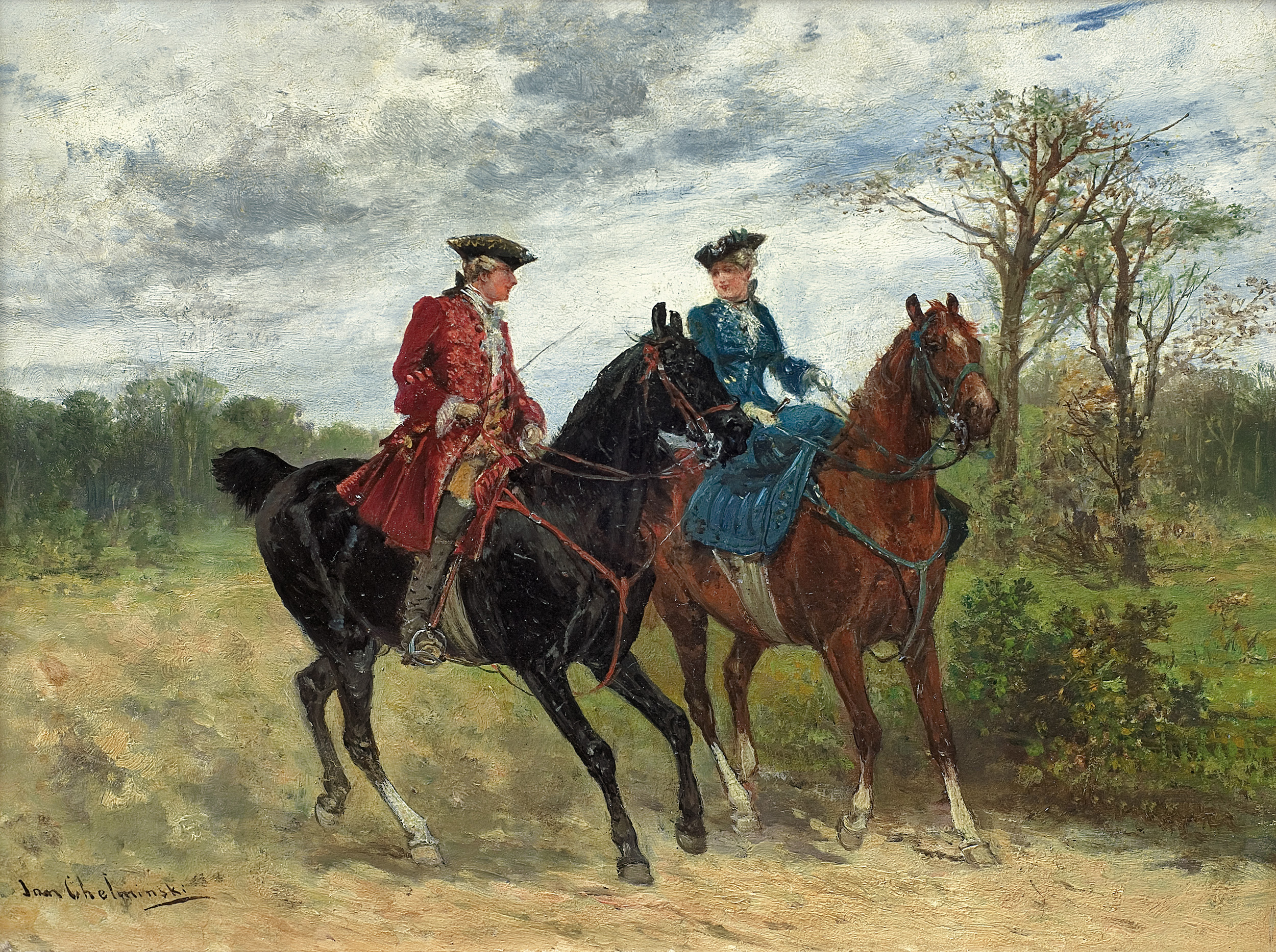 Jan Chełmiński (Brzustów k. Opoczna 1851 – Nowy Jork 1925) popularny malarz z kręgu „polskich monachijczyków“, naukę rozpoczął u Juliusza Kossaka, a następnie kształcił się w warszawskiej Klasie Rysunkowej oraz w Monachium - w Akademii u Alexandra Strähubera i Alexandra Wagnera (1873-1875) i prywatnych pracowniach Józefa Brandta (1875) i batalisty Franza Adama (1876). Po studiach przebywał już stale za granicą - w Monachium, Londynie (lata 1882, 1888-1899), Paryżu (1899), jeździł do Petersburga (1889) i Nowego Jorku (1884), gdzie później, około 1915 zamieszkał na stałe. Nie zerwał jednak kontaktów z krajem, a swoje prace często przesyłał na warszawskie wystawy. Jego obrazy cieszyły się ogromnym powodzeniem. Malował przede wszystkim sceny wojskowe i batalistycznie, najchętniej z czasów Księstwa Warszawskiego i wojen napoleońskich, a także obrazy rodzajowe i epizody z polowań. Zajmował się ilustracją książkową; m.in. ilustrował tom myśliwskich opowiadań Theodora Roosevelta. Był kolekcjonerem dawnej broni i wybitnym znawcą żołnierskiego umundurowania. Wiele obrazów artysty wciąż znajduje się za granicą - w Anglii, Niemczech czy Stanach Zjednoczonych. Nieliczne z nich pojawiają się w sprzedaży antykwarycznej, stale budząc żywe zainteresowanie zbieraczy.
