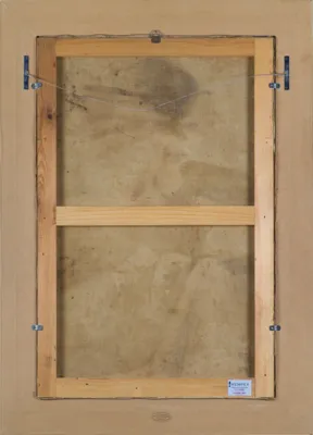 Na odwrocie blejtramu nalepka domu aukcyjnego w Warszawie; ponadto na dolnej listwie ramy pieczęć zakładu oprawy obrazów.