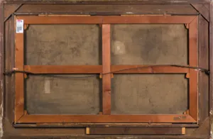 Na d. listwie krosna nalepka Towarzystwa Zachęty Sztuk Pięknych (pieczęć, druk, tusz): 41534 Autor Pa[wliszak] Wacław 41[534] | Tytuł polowani[e z sokoł]em wykon | Cena Wł; ponadto do dolnej listwy ramy przybita oryginalna rozpórka krosna z owalną pieczęcią antykwarni – Pałac Sztuki.