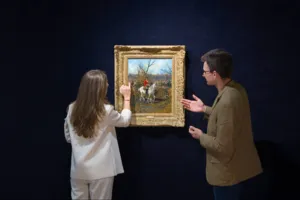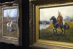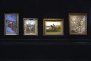 Prezentowany olej Na polowaniu możemy datować na okres wczesnej twórczości Alfreda Wierusza-Kowalskiego. W 1873 r. artysta wyjechał do Monachium, gdzie zetknął się z twórczością Maksymiliana Gierymskiego i Józefa Brandta. Gierymski, podejmując od 1870 roku tematykę polowań w stylizowanych, rokokowych strojach, wywarł ogromny wpływ na młodych malarzy polskiej kolonii monachijskiej – wśród nich właśnie na Wierusza-Kowalskiego, ale także Jana Chełmi...