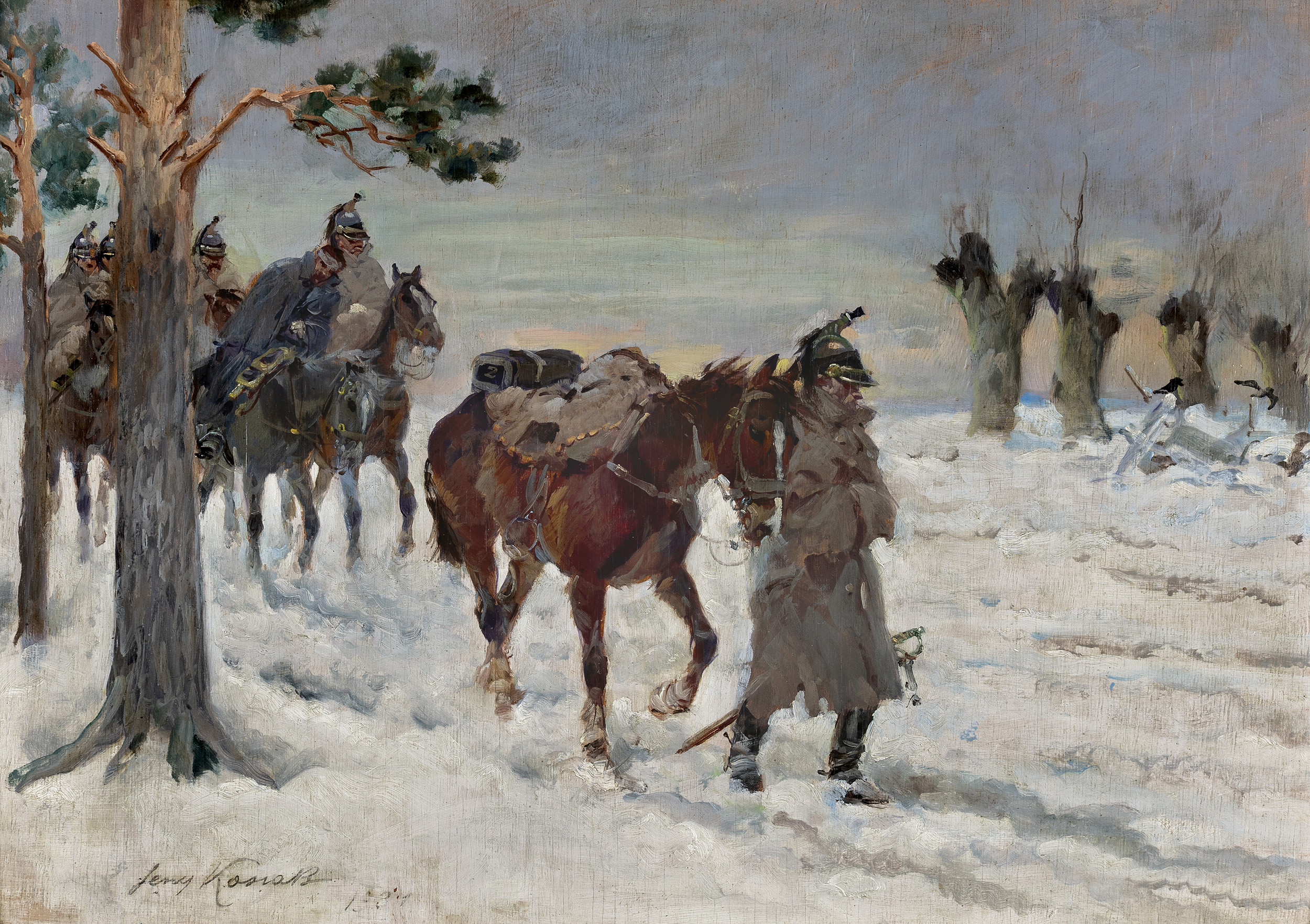Jerzy Kossak (Kraków 1886 - Kraków 1955)- syn Wojciecha, wnuk Juliusza Kossaków - od wczesnego dzieciństwa malował pod kierunkiem ojca i dziadka. Kontynuator i naśladowca ich sztuki tworzył sceny batalistyczne, historyczne i rodzajowe z wszechobecnym motywem konia. Malował obrazy z powstania listopadowego, wojen napoleońskich oraz wiele scen z wojny 1920 roku. Najbardziej znaną jego kompozycją tego rodzaju był Cud nad Wisłą. Malował też liczne Pogonie i Pościgi ułanów za kozakami, Napady wilków, Polowania i Wesela. Tematyka tych prac sprawia, że stale cieszą się zainteresowaniem zbieraczy i publiczności, zawsze tłumnie odwiedzającej wystawy malarstwa Kossaków.