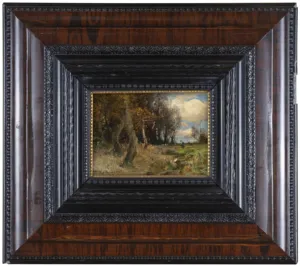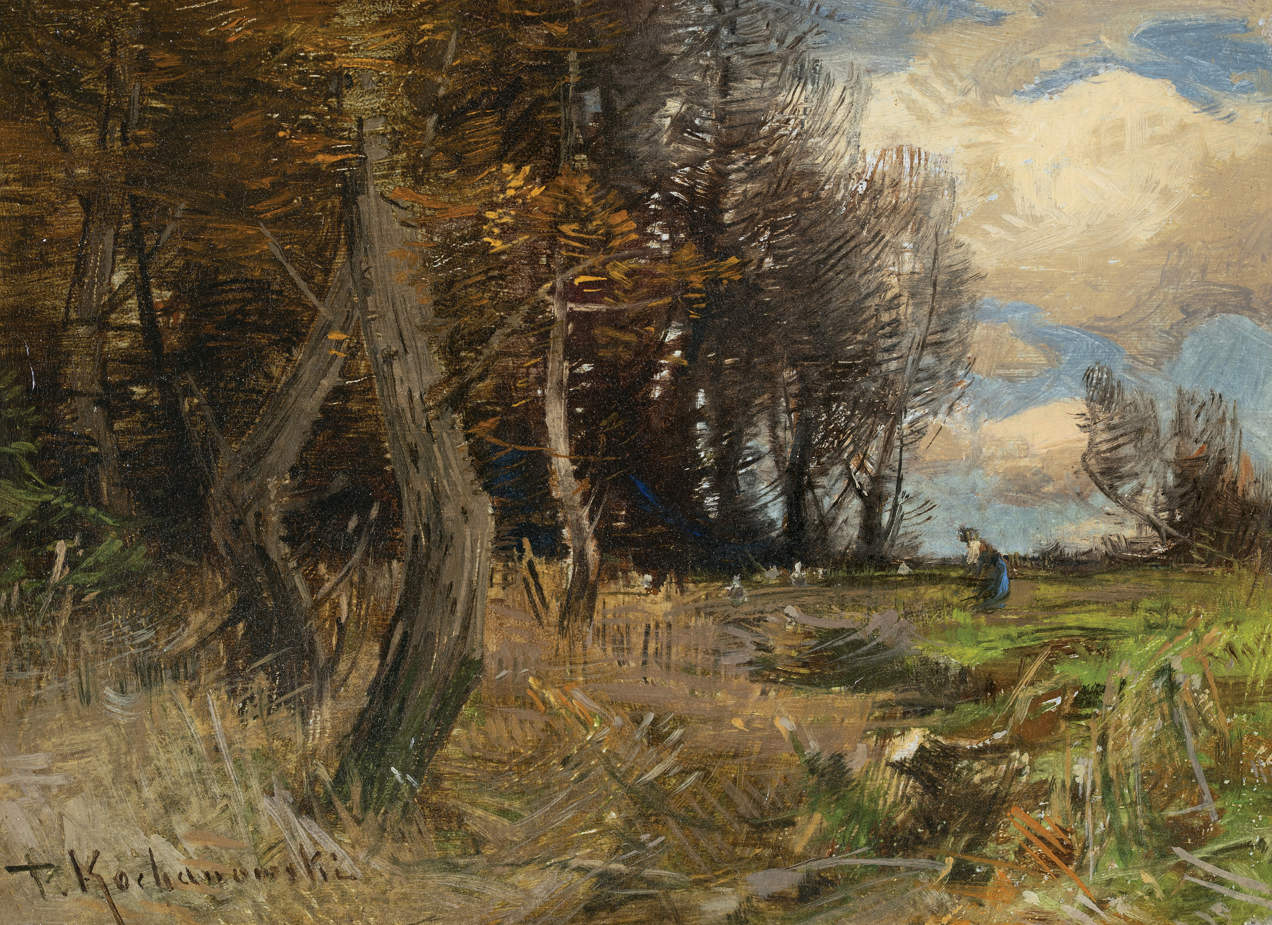 Roman Kochanowski (Kraków 1857 - Freising k. Monachium 1945) - malarz i grafik - był jednym z polskich artystów osiadłych i stałe działających w Monachium. Studia malarskie rozpoczął w Krakowie; początkowo w prywatnej pracowni Maksymiliana Cercha, a w latach 1873- 1875 w Szkole Sztuk Pięknych u Władysława Łuszczkiewicza i pejzażysty Henryka Grabińskiego. Przez następne dwa lata uczył się jeszcze na wydziale pejzażu w Akademii wiedeńskiej. W 1881 przeniósł się do Monachium, gdzie miał własną pracownię, a niebawem założył rodzinę. Często jednak przyjeżdżał do Krakowa, bywał w Poznańskiem, odbył podróż po Galicji i Podolu, rysując krajobrazy i widoki miast, które weszły następnie do albumu wydanego w Wiedniu w roku 1898. Artysta należał do monachijskiego Kunstvereinu, brał udział w wielu wystawach w Niemczech, w Wiedniu, w Londynie; swoje prace przesyłał też na pokazy krajowe. Malował przede wszystkim pejzaże a tylko z rzadka kwiaty i portrety. Stałym i ulubionym motywem jego obrazów był polski, podkrakowski krajobraz z wplecionymi weń postaciami ludzi. Obrazy artysty, malowane często na niewielkich deseczkach, pozbawione warstwy anegdotycznej odznaczają się niecodziennymi walorami malarskimi, harmonią koloru i pełnym liryzmu nastrojem. Zauważane i nagradzane na licznych wystawach były też wysoko cenione na rynku sztuki. W roku 1892, po wystawie w Wiedniu, jeden z obrazów Kochanowskiego zakupił do swoich zbiorów cesarz Franciszek Józef; dwa inne nabyli członkowie cesarskiej rodziny. Wielbicielem jego malarstwa był Karol Józef Luitpold, książę regent Bawarii. Wielka wrażliwość artysty na krajobraz i przyrodę widoczna jest także w jego rysunkach i akwafortach.