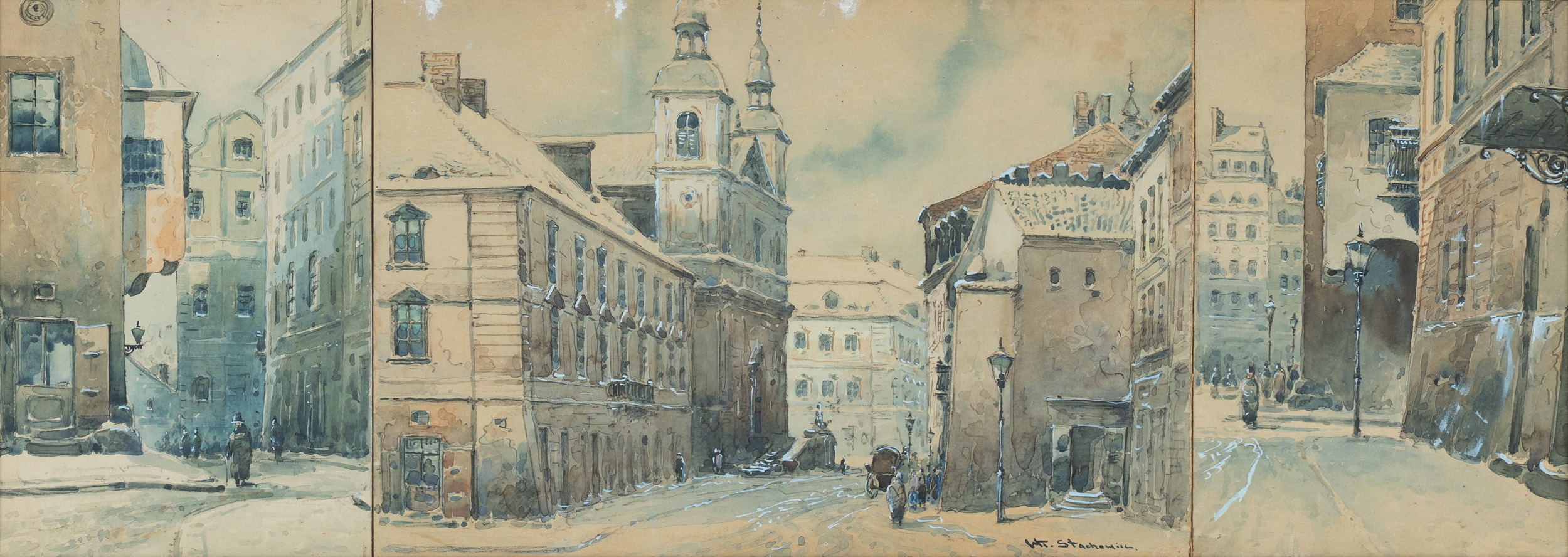 Władysław Chmieliński (Warszawa 1911 - Warszawa 1979) był malarzem związanym z Warszawą, gdzie stale mieszkał i pracował. W latach 1926-1931 studiował w warszawskiej Miejskiej Szkole Sztuk Zdobniczych i Malarstwa (dawna Klasa Rysunkowa). Wiodącym tematem jego obrazów były widoki miejskie, malowane olejno i akwarelą. W latach 1935-1938 stworzył cykl akwarel przedstawiających obiekty polskiej architektury; wśród nich, widoki Sandomierza, Krakowa, Kazimierza nad Wisłą, a także wnętrza zabytkowych kościołów czy pałaców, m.in. Zamku Królewskiego w Warszawie i Pałacu w Wilanowie. Malował także pejzaże i wiejskie sceny rodzajowe – kuligi, sanny, zaprzęgi, wesela, konie na tle krajobrazu. W latach 1967-1969 wyjeżdżał na dłuższe pobyty do Danii. W latach 1936-1939 artysta używał także pseudonimu „Władysław Stachowicz”.