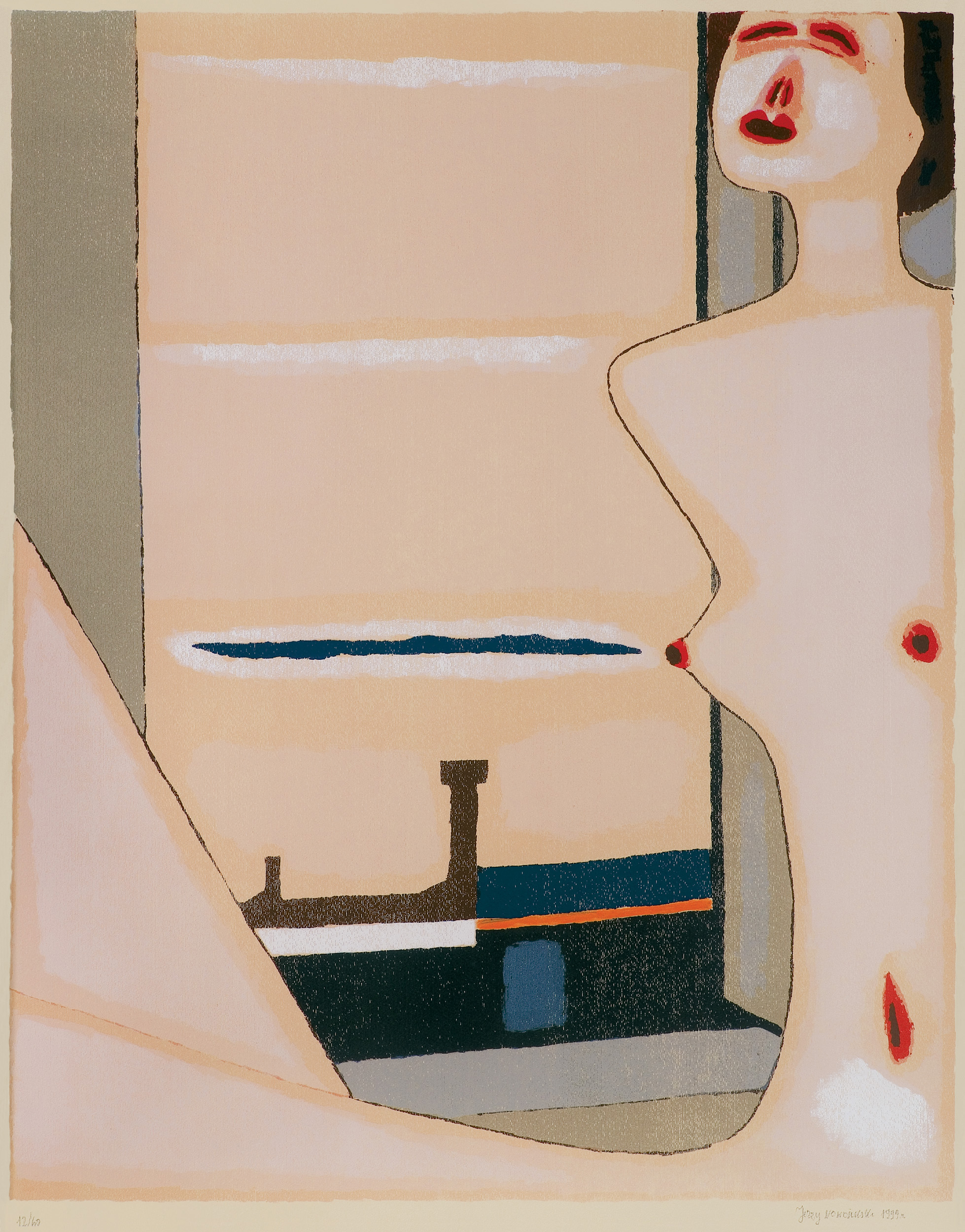 Jerzy Nowosielski (Kraków 1923 - Kraków 2011) w 1940 zaczął studia w Kunstgewerbeschule w Krakowie. W 1942 przebywał przez niecały rok w Ławrze św. Jana Chrzciciela pod Lwowem. Studiował tam sztukę malowania i historię ikon. Po powrocie do Krakowa w 1943 nawiązał ponowne kontakty z kręgiem przyszłej Grupy Krakowskiej. Po wojnie kontynuował studia w ASP w Krakowie pod kierunkiem prof. Eugeniusza Eibischa (1945-1947). Na I Wystawie Sztuki Nowoczesnej w Krakowie w 1948/49 pokazał obrazy utrzymane w nurcie abstrakcji geometrycznej. W latach socrealizmu nie wystawiał, zajmując się w tym czasie scenografią oraz malowaniem cerkwi i kościołów. W 1955 w Łodzi zaprezentował swą pierwszą wystawę indywidualną, w 1956 wziął udział w XXVIII Biennale w Wenecji. W latach 1957-1962 był pedagogiem w Państwowej Wyższej Szkole Sztuk Plastycznych w Łodzi, następnie w Akademii krakowskiej, gdzie wykładał na Wydziale Malarstwa do przejścia na emeryturę w 1993. W drugiej połowie lat 50. osiągnął charakterystyczny styl aktów, pejzaży i scen figuralnych we wnętrzach, który zawdzięczał swej fascynacji ikoną i doświadczeniom z malarstwem sakralnym. W 1976 podjął na nowo realizacje monumentalne, wykonując m.in. malowidła ścienne, stacje Drogi Krzyżowej i projekty witraży w kościele Opatrzności Bożej w Wesołej pod Warszawą (1976-1979). Artysta powszechnie uznawany był za autorytet w dziedzinie sztuki zakorzenionej w wartościach duchowych.
