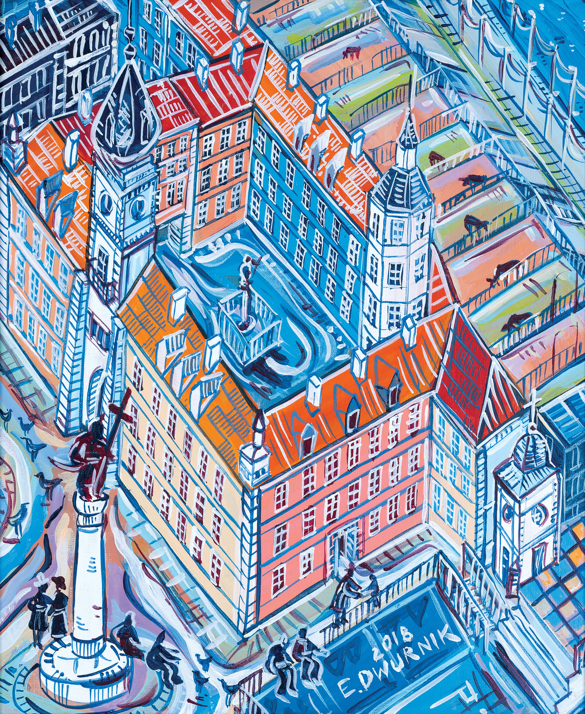 Edward Dwurnik (Radzymin 19 IV 1943 - Warszawa 28 X 2018) studiował malarstwo w ASP w Warszawie (1963-1970), jednak jako swego „mistrza“ wymienia Nikifora. Jego to prace, zobaczone po raz pierwszy w 1965, zainspirowały ówczesnego studenta III roku do narysowania pierwszych prac z cyklu „Podróże autostopem“, które kontynuował w nastepnych latach. W 1972-1978 powstawał cykl „Sportowcy“, w którym portretowane były, dodajmy - kąśliwie, typowe postaci z lat 70. Równolegle od 1975 powstawał cykl „Robotnicy“, który kulminował w okresie „Solidarności“ 1980-1981. Za prace z tego cyklu Dwurnik otrzymał w 1981 Nagrodę Krytyki Artystycznej im. Cypriana Kamila Norwida, natomiast za obrazy z cyklu „Warszawa“ (1981), proroczo zapowiadające stan wojenny - Nagrodę Kulturalną „Solidarności“ podziemnej w 1983. W latach 80. malarstwo Dwurnika przybrało wyraz ekspresyjny i dramatyczny. Powstające w tej dekadzie obrazy miały niejednokrotnie wymowę polityczną, przybierały też kostium historyczny, tak czy inaczej odnoszący się do współczesnych spraw i realiów. Cykl „Droga na Wschód“ (1989-91) upamiętniał ofiary stalinizmu, natomiast cykl „Od Grudnia do Czerwca“ (1990-94) - ofiary stanu wojennego. Zarówno ideowe, jak i czysto malarskie walory tych prac przyniosły artyście ogromne uznanie, zarówno w kraju jak i za granicą. Jego wyrazem była prestiżowa nagroda Fundacji Coutts & Co w Zurychu (1992). W latach 90. powstają cykle będące kontynuacją „Podróży autostopem“: „Niebieskie miasta“ (od 1993) i „Diagonale“ (od 1996), jak również kompozycje nowego typu, jak widoki morskie (cykl „Błękitne“, 1992-93) czy cykl „Wyliczanka“ (1996-99). Artysta wiele wystawia, miał ok. 100 wystaw indywidualnych w Polsce i za granicą, brał też udział w licznych wystawach i festiwalach krajowych i międzynarodowych, m.in.: X Biennale Sztuki Współczesnej, Menton 1974, Documenta 7, Kassel 1982, 5th Biennale, Sydney 1985, XIX Biennale Sztuki, Sao Paulo 1987; Olimpiada Sztuki, Seul 1988. Równolegle z malarstwem uprawiał rysunek, collage, grafikę warsztatową (litografia, techniki metalowe, kserografia, stemple) i użytkową (ilustracja, plakaty do własnych wystaw indywidualnych).