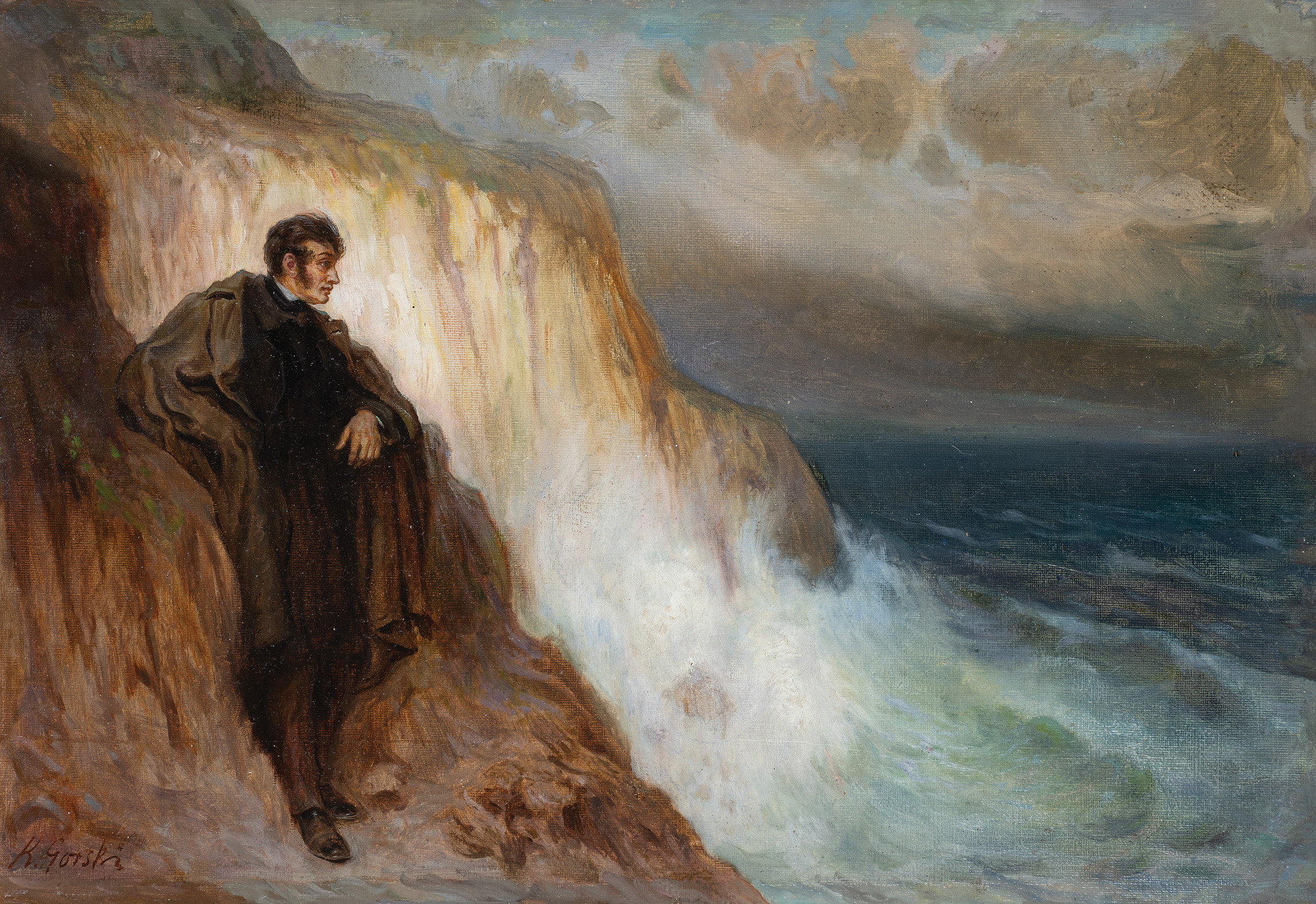 W przeciwieństwie do kanonicznej ikonografii XVIII sonetu krymskiego Ajudah (1825-26) Mickiewicza, autorstwa Walentego Wańkowicza, gdzie wieszcz wspiera się o skałę na szczycie góry, tutaj poeta został ukazany na urwistym, eksponowanym nawisie skalnym – bezpośrednio nad morzem. Choć analogiczne ujęcie odnajdziemy w kompozycji Stefana Popowskiego (opublikowanej w „Tygodniku Ilustrowanym“, 1899, nr 52), prawdopodobnym źródłem inspiracji Gorskiego były płótna Iwana Ajwazowskiego przedstawiające ...