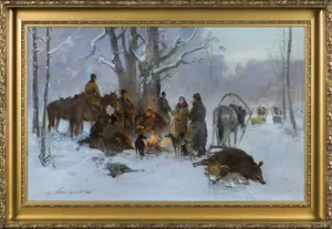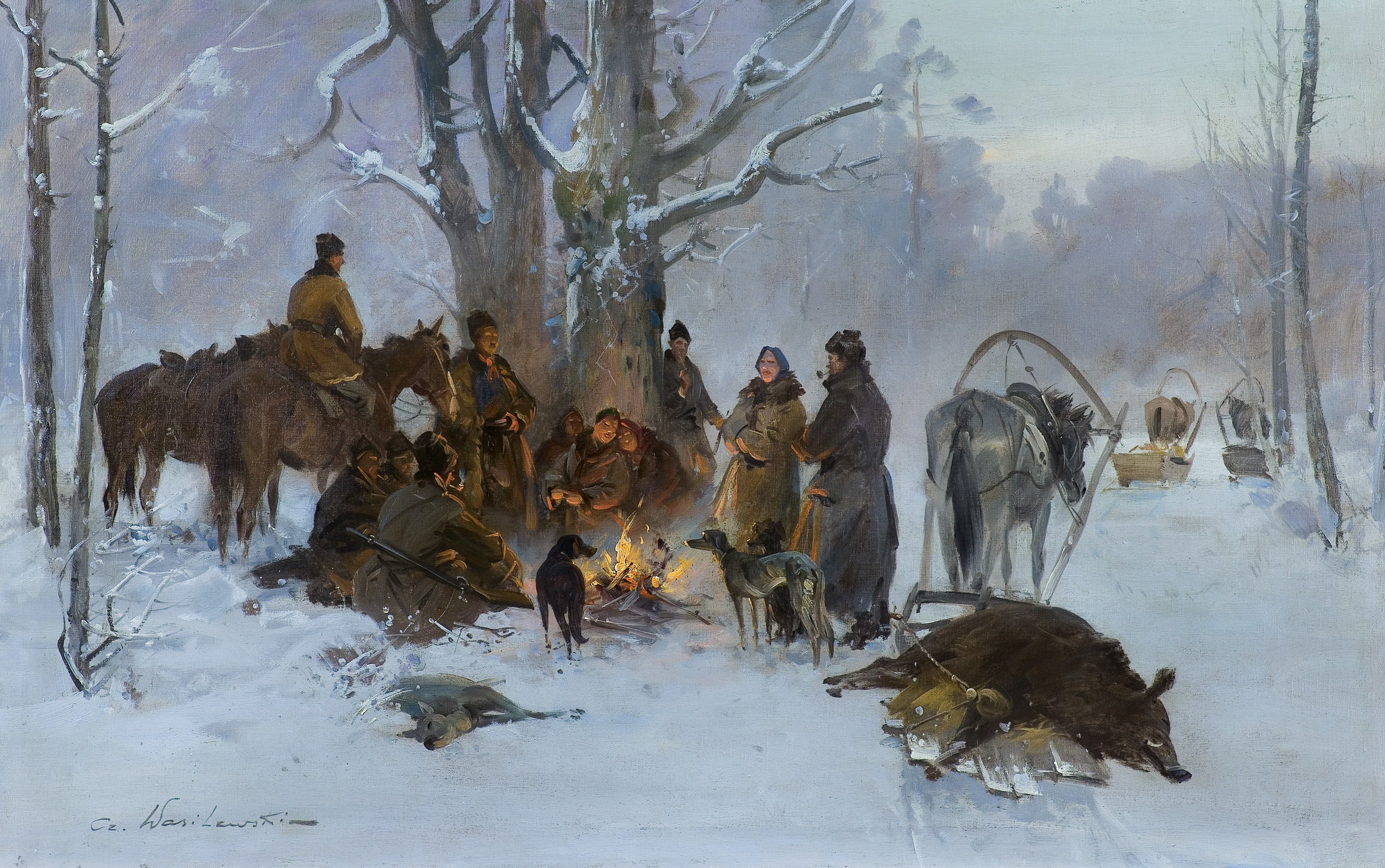 Czesław Wasilewski (ok. 1875 - Warszawa/ Łódź 1946?47) to popularny w okresie międzywojennym warszawski malarz, autor obrazów inspirowanych płótnami Kossaka, Brandta, Chełmońskiego, Wierusza-Kowalskiego czy Fałata. Był samoukiem; wprawdzie w 1911 zapisał się do warszawskiej Szkoły Sztuk Pięknych, ale o jego studiach nic bliższego nie wiadomo. Być może uczęszczał tam (1913-1917) do pracowni Wojciecha Kossaka, dla którego później, na początku lat dwudziestych, przygotowywał podmalówki do obrazów. Uczestniczył w wystawie w Lublinie (1922), wystawiał na Salonach warszawskiej Zachęty (1925,1926, 1927), w Katowicach (1926), Częstochowie (1927), Gdyni (1929), Kaliszu (1931), Poznaniu (1928, 1931). Malował przede wszystkim liczne zaprzęgi, sanny, wyjazdy na polowania, wypadki w podróży, ułanów na patrolu, łosie, sarny i dziki w lesie. Tworzył także nastrojowe pejzaże, wyraźnie inspirowane malarstwem J. Chełmońskiego Rzadziej malował także kwiaty i martwe natury. Utożsamiany z malarzem o nazwisku „Zygmuntowicz”, którego prace pojawiały się na rynku sztuki od trzydziestych lat XX wieku. Stawiany przed tym nazwiskiem inicjał I. lub F., sugerować może imię Ignacy lub Franciszek. Sylwetkę malarza bliżej omówił S. Bołdok w artykule Malarz o dwóch nazwiskach (Art and Business 1992, nr 7-8, s. 48-49).