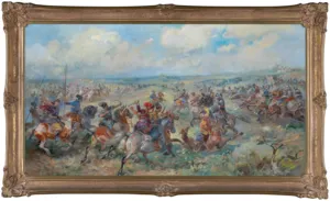 Antoni Trzeszczkowski – (1902–1977) to artysta, który niesłusznie pozostaje w cieniu bardziej znanych batalistów, mimo że jego twórczość dorównuje najlepszym przedstawicielom tego gatunku. Jego malarstwo cechuje niezwykła dynamika, precyzja rysunku oraz wyjątkowe wyczucie ruchu, zwłaszcza w przedstawieniach koni i bitewnych scen. W jego obrazach można dostrzec pasję i głęboką znajomość wojskowości, co sprawia, że są one nie tylko dziełami sztuki, ale także wartościowymi rekonstrukcjami historycznymi.