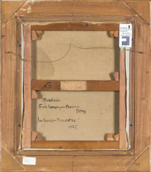 Na odwrocie, napis ręką artysty (czarną farbą): Mondzain | 5 rue Campagne-Premiere | Paris | „La Roche – Pradiere“ | 1928.; Na poprzeczce krosna (czarną farbą): No 18; obok nalepka (druk, tusz): M No 2 10F | Remis; ponadto nalepki aukcyjne.