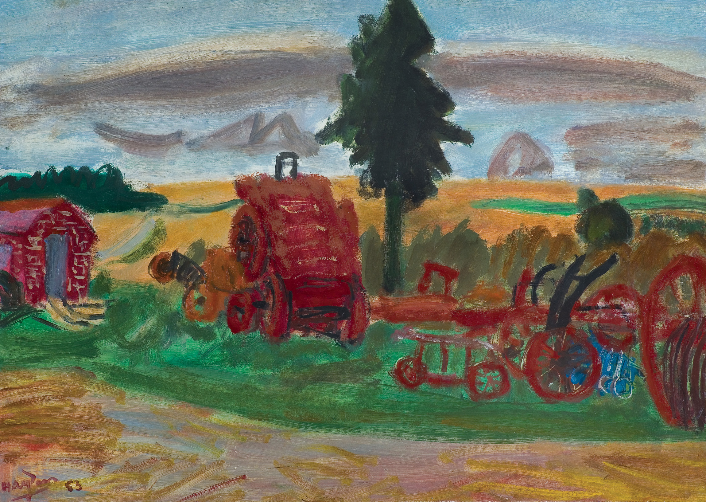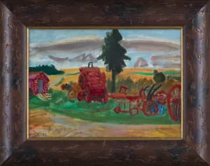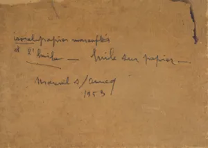 Na odwrocie napis (czerwoną kredką, poprawiony czarną kredką): isorelpapier marouflé | a l’huile – huile sur papier- | Mareuil s / Ourcq | 1953
