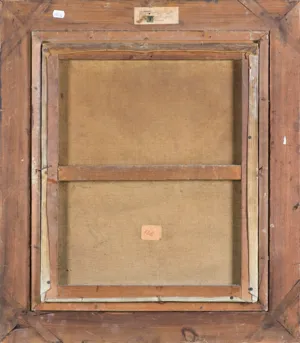 Na odwrocie na górnej listwie ramy pieczęć z numerem odnoszącym się do wielkości podobrazia: 10 F; ponadto na płótnie nalepka z nr. (czerwonym flamastrem): 126. Na g. listwie ramy nalepka paryskiego zakładu ramiarskiego.