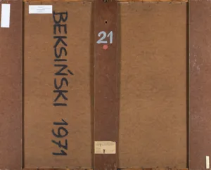 sygn. na odwrocie: BEKSIŃSKI 1971, na środkowym wzmocnieniu płyty napis: 21 i nalepka: K.M.P. i K. „RUCH“ WARSZAWA | GALERIA WSPÓŁCZESNA | AUTOR Zdzisław Beksiński | ... Wystawa 7 XII 72 – 7 I 73