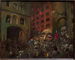 Na tłumnie odwiedzanej ekspozycji znalazło się prezentowane w katalogu przedstawienie apokaliptycznego miasta okupowanego przez zbiorowisko potwornych postaci o okaleczonych i zdeformowanych ciałach. Udręczone istoty, scalone gęstą pajęczyną w jeden organizm, niczym piekielna magma przetaczają się przez ulice. Twarze kreatur są powykrzywiane w grymasach niszczycielskiej furii i szyderstwa lub – wręcz przeciwnie – przerażenia i bólu. Agresorzy i ofiary kotłują się wespół w scenerii pełnej symbolicznych odwołań do śmierci i przemijania, obrazując współczesną wizję sądu ostatecznego. Tego rodzaju „dreszczcowcowe“ treści – właściwe całej grupie „Oczekiwania“ – spotkały się z żywym odzewem publiczności i odbiły szerokim echem w ówczesnej prasie, a na ich kanwie zrealizowano nawet film dokumentalny Rozmowa Mistrza ze śmiercią (reż. Franciszek Kuduk, 1973). Chociaż wiele reakcji i recenzji sprowadzało się do zarzucenia artyście epatowania horrorem i propagowania okrucieństwa, żaden z budzących grozę pejzaży nie wrócił do pracowni. Beksiński notował w swoim dzienniku: malować muszę teraz jak wściekły, bo na lipiec, a może nawet i na czerwiec, muszę mieć obrazy na wystawę z Urbanowiczem i Wańkiem, więc jeśli wszystko kupiono (hi, hi), to nie mam co wystawiać, jestem goły! (M. Grzebałkowska, Beksińscy. Portret podwójny, Kraków 2016, s. 156). Wystawa, będąca niewątpliwym sukcesem komercyjnym, znacznie przyczyniła się do rozsławienia nazwiska „piewcy totalnego strupieszenia świata“, wyznaczając moment zwrotny w jego długoletniej karierze. Obrazy, które brały w niej udział, spotykają się z niegasnącym zainteresowaniem miłośników i kolekcjonerów sztuki Beksińskiego, a każde ich pojawienie się na rynku aukcyjnym jest wydarzeniem dużej wagi.