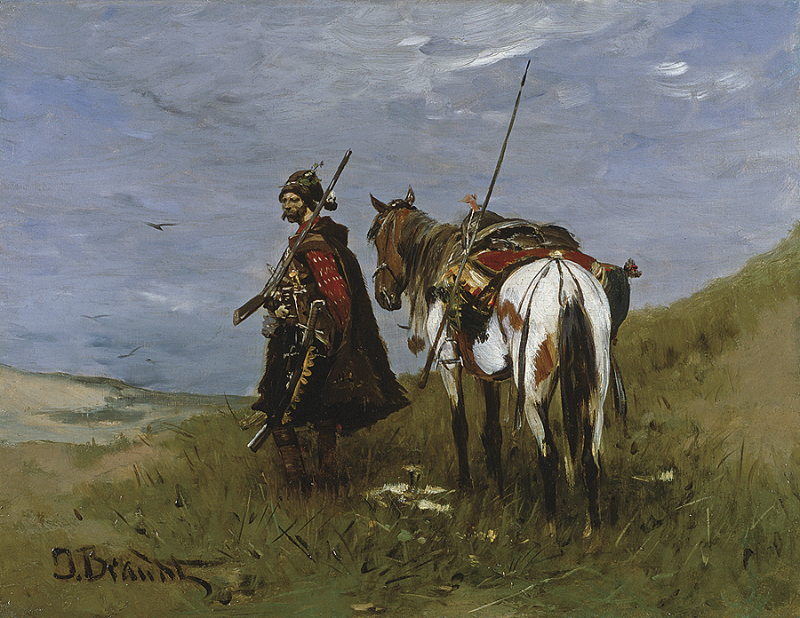 Józef Brandt (Szczebrzeszyn 1841 - Radom 1915) był jednym z najwybitniejszym polskich malarzy batalistów. Naukę malarstwa rozpoczął w Warszawie pod okiem Juliusza Kossaka. W latach 1858-1860 był w Paryżu, gdzie podjął studia inżynierskie. Niebawem zarzucił je jednak na rzecz malarstwa i kształcił się w pracowni Leona Cognieta. Po powrocie do kraju, w 1861 debiutował na wystawie w warszawskim TZSP. Od 1863 kontynuował studia w monachijskiej ASP u Franza Adama. W 1870 otworzył w Monachium własną pracownie i niebawem stał się przywódcą, „generałem” tamtejszej polskiej kolonii artystycznej i nauczycielem wielu malarzy. Po 1877 miesiące letnie spędzał w Orońsku, zapraszając na plenery grono swych uczniów. Został honorowym profesorem Akademii w Monachium (1878), członkiem Akademii w Berlinie (1877) i Pradze (1900). Odznaczony wysokimi orderami, wyróżniany medalami i nagrodami na międzynarodowych wystawach, cieszył się prawdziwie europejską sławą. Mieszkając i tworząc poza krajem zawsze wyraźnie podkreślał swoją polskość; dając jej wyraz choćby poprzez podpisywanie obrazów Józef Brandt z Warszawy. Malował bitwy, potyczki, podjazdy – epizody z historii polskich wojen kresowych i wojen szwedzkich XVII wieku, a także sceny rodzajowe – jeźdźców, polowania, jarmarki. Jego barwne, pełne ruchu i perfekcyjne warsztatowo obrazy podziwiano powszechnie, jako najlepszy przykład wysoko wówczas cenionej „szkoły polskiej”. Ale podczas gdy niemiecki czy francuski widz dostrzegał w nich przede wszystkim egzotykę i barwy Orientu, dla Polaków były to płótna „prawdziwe, naturalne, swojskie jak fragmenty z pamiętników Paska albo Rzewuskiego, przetransponowane na barwy i linie”. |