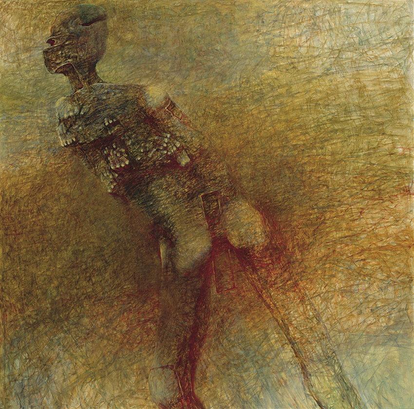 Zdzisław Beksiński (Sanok 24 II 1929 - Warszawa 21 II 2005) studiował w latach 1947-1952 na Wydziale Architektury Politechniki Krakowskiej. Był artystą samoukiem, który osiągnął niekwestionowaną pozycję w polskiej sztuce współczesnej, potwierdzoną obecnością jego prac na prestiżowych wystawach i w kolekcjach muzealnych. Początkowo zajmował się fotografią, którą interesował się od lat studenckich, po 1956 zyskując uznanie jako twórca fotogramów o estetyce opartej o efekty fakturowe. W latach 1958-1962 tworzył abstrakcyjne obrazy-reliefy o bogatej fakturze, głównie metalowe, będące odmianą malarstwa materii. Pod koniec tego okresu powstawały ażurowe formy o kształtach figur i pełnoplastyczne rzeźby w metalu. Kolejnym etapem jego twórczości były lata 1962-1974, kiedy poświęcał się głównie rysunkowi. W latach 60. rysował piórkiem i tuszem figuralne kompozycje odznaczające się karykaturalną deformacją postaci. Od końca lat 60. tworzył rysunki węglem i kredkami, będące monochromatyczną odmianą jego równoległej twórczości malarskiej. Od 1974 zajmował się niemal niepodzielnie malarstwem. Jego charakterystyczny styl bazował na perfekcji technicznej, której towarzyszyła niezwykłość wizji. Malował świat po katastrofie, naznaczony piętnem śmierci i rozpadu. Jego obrazy zaludniają postaci i stwory o ludzkich wprawdzie bądź zwierzęcych kształtach, lecz o cechach fantomów, automatów lub rozpadających się trucheł. Artysta nie nadawał swym obrazom i rysunkom tytułów (poza porządkującymi symbolami), akcentując w ten sposób swój brak zainteresowania dla literackiej strony przedstawień. Sam mówił, że malując całkowicie poddaje się wizji, „fotografuje“ ją. W ostatnich latach włączył do swego warsztatu artystycznego elektroniczne techniki generowania obrazu, które wykorzystywał do tworzenia komputerowych fotomontaży. Sztuka Beksińskiego, wielokrotnie wystawiana i omawiana, budzi skrajne emocje wśród znawców i publiczności.