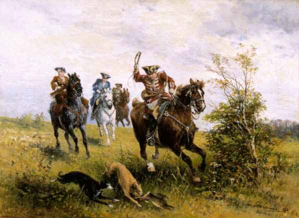 Jan Chełmiński (Brzustów k. Opoczna 1851 – Nowy Jork 1925) popularny malarz z kręgu „polskich monachijczyków“, naukę rozpoczął u Juliusza Kossaka, a następnie kształcił się w warszawskiej Klasie Rysunkowej oraz w Monachium - w Akademii u Alexandra Strähubera i Alexandra Wagnera (1873-1875) i prywatnych pracowniach Józefa Brandta (1875) i batalisty Franza Adama (1876). Po studiach przebywał już stale za granicą - w Monachium, Londynie (lata 1882, 1888-1899), Paryżu (1899), jeździł do Petersburga (1889) i Nowego Jorku (1884), gdzie później, około 1915 zamieszkał na stałe. Nie zerwał jednak kontaktów z krajem, a swoje prace często przesyłał na warszawskie wystawy. Jego obrazy cieszyły się ogromnym powodzeniem. Malował przede wszystkim sceny wojskowe i batalistycznie, najchętniej z czasów Księstwa Warszawskiego i wojen napoleońskich, a także obrazy rodzajowe i epizody z polowań. Zajmował się ilustracją książkową; m.in. ilustrował tom myśliwskich opowiadań Theodora Roosevelta. Był kolekcjonerem dawnej broni i wybitnym znawcą żołnierskiego umundurowania. Wiele obrazów artysty wciąż znajduje się za granicą - w Anglii, Niemczech czy Stanach Zjednoczonych. Nieliczne z nich pojawiają się w sprzedaży antykwarycznej, stale budząc żywe zainteresowanie zbieraczy.