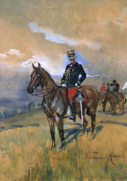 Wojciech Kossak (Paryż 1856 - Kraków 1942 ) – powszechnie znany malarz, postrzegany przede wszystkim jako świetny batalista. Syn i uczeń Juliusza Kossaka kształcił się w krakowskiej Szkole Sztuk Pięknych, w Akademii monachijskiej oraz w Paryżu. W latach 1895-1902 przebywał głównie w Berlinie, pracując dla cesarza Wilhelma II. Wiele podróżował, m.in. do Hiszpanii i Egiptu, gdzie wykonywał szkice do zamierzonych panoram. W późniejszych latach kilkakrotnie wyjeżdżał do Stanów Zjednoczonych wykonując zamówienia portretowe. W 1913 był mianowany profesorem warszawskiej Szkoły Sztuk Pięknych. W latach I wojny światowej pełnił służbę wojskową. Był współautorem panoram: „Racławice” (1893-1894), „Berezyna” (1895-1896), „Bitwa pod piramidami” (1901) oraz szkiców do niezrealizowanej „Somosierry” (1900). Z temperamentem i swobodą tworzył szeroko malowane, dynamiczne sceny batalistyczne, historyczne, rodzajowe oraz liczne portrety. Z upodobaniem malował konie. Jego obrazy, gloryfikujące dawne i współczesne artyście polskie wojsko i bohaterstwo żołnierzy, trafiały do patriotycznych uczuć odbiorców i cieszyły się ogromna popularnością.