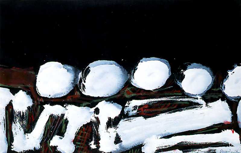 Tadeusz Dominik (Szymanów 14 I 1928 - Warszawa 20 V 2014) studiował na Wydziale Malarstwa ASP w Warszawie pod kierunkiem prof. J.Cybisa (1946-51, dyplom 1953). Od 1951 był pedagogiem na macierzystym Wydziale, początkowo jako asystent Cybisa. Od 1965 prowadził własną pracownię, w 1979 otrzymał tytuł profesora. W 1990 przeszedł na emeryturę. W czasie studiów oddziałały nań - za pośrednictwem osobowości i sztuki Cybisa - idee polskiego koloryzmu, które następnie twórczo i samodzielnie kontynuował. Początkowo tworzył obrazy figuratywne. Debiutował na słynnej wystawie w warszawskim Arsenale w 1955, gdzie zdobył nagrodę. W tym okresie obok malarstwa uprawiał drzeworyt, operujący szerokimi płaszczyznami bieli i czerni (drzeworyty wystawiał m.in. na Biennale w Wenecji w 1956). W drugiej poł. lat 50. zaczął malować obrazy abstrakcyjne, początkowo utrzymane w ekspresyjnej i spontanicznej stylistyce malarstwa informel. W latach 60. wzbogacił swe prace o efekty fakturowe. Niezmienną inspiracją była dla malarza natura, bogactwo i kolorystyka jej form. Pozostał jej wierny do dziś, poddając zmianom sam sposób malowania. Stopniowo rozjaśniał i wygładzał swe kompozycje, wprowadzając efekty dekoracyjne, jak rytmiczne powtórzenia form czy rodzaj malowanych „rastrów“, regularnie znaczących fragmenty kompozycji. Wśród wielu nagród otrzymał m.in. laur „Złotego Grona“ w Zielonej Górze w 1963, Grand Prix Festiwalu Polskiego Malarstwa Współczesnego w Szczecinie w 1968, nagrodę im. George’a Rowney’a w Londynie w 1973 i Nagrodę im. Jana Cybisa w Warszawie w 1973. Równolegle z malarstwem zajmował się gobelinem, ceramiką, również grafiką komputerową.