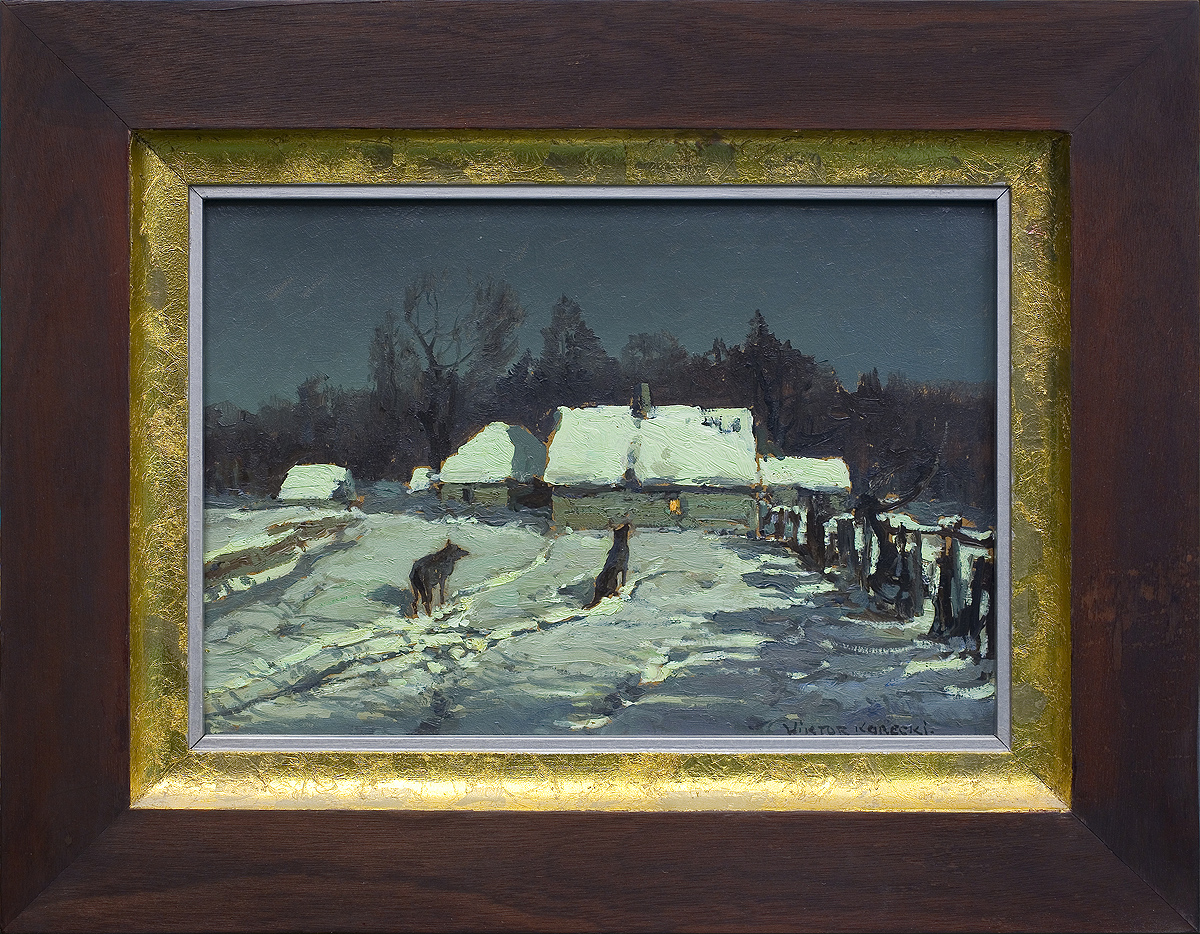 Wiktor Korecki (Kamieniec Podolski 1890 - Komorów k. Warszawy 1980) - malarz pejzażysta - gimnazjum ukończył w Kijowie, tam też studiował w Szkole Rysunkowej Aleksandra Muraszki. Po studiach wrócił do Kamieńca Podolskiego, skąd w roku 1921 wyjechał do Warszawy. Tu miał pracownię na rogu ulic Tamki i Cichej. Niestety zgromadzone tam obrazy spłonęły w czasie powstania 1944 roku. Po powstaniu artysta przebywał w obozie w Pruszkowie skąd trafił do obozu pracy w Lipsku. Do kraju powrócił w roku 1946 i zamieszkał w Komorowie pod Warszawą, a później w Milanówku. Jego nastrojowe krajobrazy emanujące spokojem i pogodą cieszyły się zawsze dużą popularnością. Korecki najczęściej malował pejzaże zimowe z motywem leśnej drogi i strumienia wijącego się wśród śniegów, a obok nich także wiosenne, letnie czy jesienne widoki z Mazowsza.