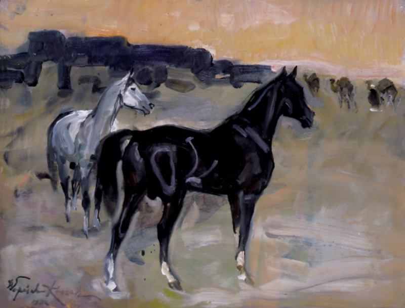 Wojciech Kossak (Paryż 1856 - Kraków 1942 ) – powszechnie znany malarz, postrzegany przede wszystkim jako świetny batalista. Syn i uczeń Juliusza Kossaka kształcił się w krakowskiej Szkole Sztuk Pięknych, w Akademii monachijskiej oraz w Paryżu. W latach 1895-1902 przebywał głównie w Berlinie, pracując dla cesarza Wilhelma II. Wiele podróżował, m.in. do Hiszpanii i Egiptu, gdzie wykonywał szkice do zamierzonych panoram. W późniejszych latach kilkakrotnie wyjeżdżał do Stanów Zjednoczonych wykonując zamówienia portretowe. W 1913 był mianowany profesorem warszawskiej Szkoły Sztuk Pięknych. W latach I wojny światowej pełnił służbę wojskową. Był współautorem panoram: „Racławice” (1893-1894), „Berezyna” (1895-1896), „Bitwa pod piramidami” (1901) oraz szkiców do niezrealizowanej „Somosierry” (1900). Z temperamentem i swobodą tworzył szeroko malowane, dynamiczne sceny batalistyczne, historyczne, rodzajowe oraz liczne portrety. Z upodobaniem malował konie. Jego obrazy, gloryfikujące dawne i współczesne artyście polskie wojsko i bohaterstwo żołnierzy, trafiały do patriotycznych uczuć odbiorców i cieszyły się ogromna popularnością.
