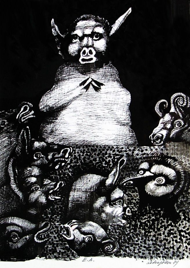 Jan Lebenstein (Brześć Litewski 1930 - Kraków 1999) w latach 1948-1954 studiował malarstwo w ASP w Warszawie pod kierunkiem prof. Eugeniusza Eibischa i Artura Nachta-Samborskiego. W 1955 wziął udział w wystawie w warszawskim Arsenale. Zaprzyjaźniony w czasie studiów z Mironem Białoszewskim, swą pierwszą wystawę indywidualną pokazał w 1956 w Teatrze na Tarczyńskiej. W 1959 zdobył Grand Prix de la Ville de Paris na I Biennale Młodych w Paryżu i w tym roku przeniósł się na stałe do Paryża. Po seriach "figur kreślonych" (na papierze milimetrowym) i "figur hieratycznych" z lat 1955-1958 maluje cykl "figur osiowych" (1958-1962), które wystawia w Paryżu i USA. Równolegle w 1960 zaczyna rysowane "karnety", rodzaj dziennika, który w przyszłości dostarczy motywów wykorzystanych w obrazach. W latach 1964-1965 maluje "Bestiarium", cykl fakturowych, archaizowanych stworów przypominających prehistoryczne wykopaliska. Bezpośrednio po nich wprowadza do swych obrazów postaci ludzkie i fantastyczne, odgrywające sceny ni to mitologiczne, ni to ze snu, często przesycone erotyką. W 1970 projektuje witraże dla Centre du Dialogue w Paryżu. W W 1971 otrzymuje obywatelstwo francuskie 1974 powstają gwasze inspirowane Folwarkiem zwierzęcym George'a Orwella. W latach 1976-1989 tworzy wyłącznie w technice gwaszu i pastelu, podejmując tematykę mitologiczną i zaczerpniętą z Biblii: cykle ilustracji do Księgi Hioba (wyd. 1979) i do Apokalipsy (wyd. 1986) w nowych przekładach Czesława Miłosza. W 1989 powraca do malarstwa olejnego (cykl "Pergamon"). Artysta otrzymał m. in. nagrodę Fundacji im. Alfreda Jurzykowskiego w 1976, Nagrodę Muzeum Archidiecezji Warszawskiej w 1985, Nagrodę im. Jana Cybisa w 1987.
