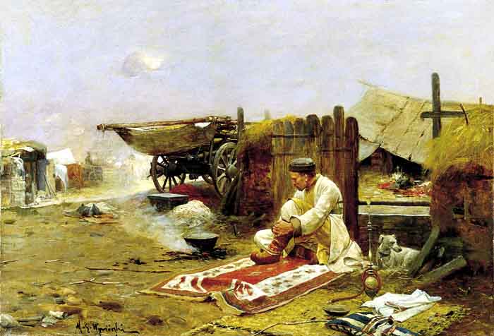 Michał Gorstkin Wywiórski (Warszawa 1861 - Berlin 1926) w latach 1883-1887 studiował w Monachium; w Akademii u profesorów Karla Raupa i Nikolausa Gysisa oraz równolegle w prywatnych pracowniach Józefa Brandta i Alfreda Wierusza-Kowalskiego. W 1884 debiutował na wystawie w krakowskim TPSP, swoje prace pokazywał też w Monachium, gdzie w 1894 na międzynarodowej wystawie w Glaspalast został wyróżniony medalem za obraz Z puszczy litewskiej. W 1895 przeniósł się do Berlina, zaproszony przez Wojciecha Kossaka i Juliana Fałata do pracy przy panoramie Berezyna (1895-1896). W Berlinie zamieszkał na dłużej, a następnie przebywał w Wielkopolsce i w Warszawie. Współpracował też z Janem Styką przy panoramie Bitwa pod Sybinem (1897), a w 1900 wspólnie z Kossakiem podróżował do Hiszpanii i Egiptu, aby wykonać szkice plenerowe do zamierzonych panoram Somosierra (nie zrealizowana) i Bitwa pod piramidami (1901). Wyjeżdżał także na Litwę, wyspę Sylt, do Norwegii, Szwecji, nad Morze Północne i Bałtyk, malował w Amsterdamie, na Krymie i Kaukazie. We wczesnej fazie twórczości, pod silnym wpływem Brandta i Wierusza-Kowalskiego, malował sceny myśliwskie i rodzajowe oraz obrazy z Tatarami, Kozakami czy Czerkiesami, które przyniosły mu powodzenie na monachijskim rynku sztuki. Z czasem naczelnym tematem jego malarstwa stał się czysty pejzaż, postrzegany i malowany wrażliwie i z upodobaniem.
