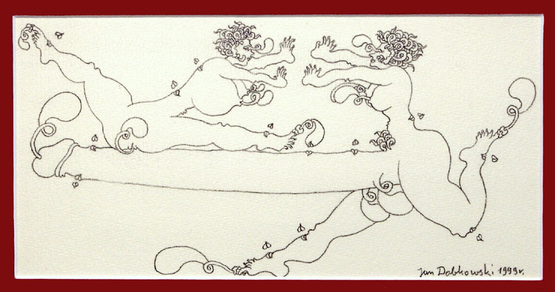 Jan Dobkowski (Łomża 1942, mieszka w Warszawie) studiował w latach 1962-1968 na Wydziale Malarstwa warszawskiej ASP pod kierunkiem prof. Juliusza Studnickiego i Jana Cybisa. Będąc jeszcze na studiach, w 1966, utworzył duet artystyczny, w którym jego partnerem był Jerzy (Jurry) Zieliński. Ich pierwsza wspólna wystawa pn. Neo-Neo-Neo odbyła się w Warszawie w 1967. Wystawiali wspólnie do 1970. W 1968 powstały pierwsze zielono-czerwone obrazy Dobkowskiego (używającego w tym czasie pseudonimu Dobson). W pracach tych, operujących giętkimi, falistymi liniami, w których upatrywano wpływów secesji, artysta używał sposobów rodem z op-artu dla wywołania złudzeń optycznych (wirowanie, mżenie, pozorny ruch form). Równolegle z obrazami tworzył też formy z płyt i folii do montowania w przestrzeni. Złoty medal na Sympozjum Złotego Grona w Zielonej Górze w 1971 i blisko roczny pobyt w USA na stypendium Fundacji Kościuszkowskiej w 1972 to kolejne etapy pełnej sukcesów kariery malarza. Wyraźną zmianę nastroju i wymowy jego prac przyniosły wydarzenia 1980-1981 roku, zwłaszcza wprowadzenie stanu wojennego. Monochromatyczne, ciemne płótna znaczył wtedy nikłymi, wiotkimi liniami rysunku. Najczęstszym motywem były patriotyczne i religijne symbole, dopowiadane tytułami nawiązującymi do realiów czasu. Kolejna radykalna zmiana nastąpiła ok. 1990. Symbolicznym zwiastunem nowego okresu stał się olbrzymi, radosny, eksplodujący bogactwem barw, kształtów i ruchu obraz ...a życie sobie płynie... (394 x 588 cm) z 1990-1991. Podobne cechy formalne charakteryzują twórczość artysty w całej dekadzie lat 90. Równolegle z malarstwem Dobkowski pracuje nad rysunkiem, będącym bardzo ważnym dopełnieniem jego twórczości.
