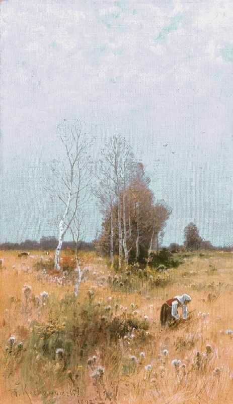 Roman Kochanowski (Kraków 1857 - Freising k. Monachium 1945) - malarz i grafik - był jednym z polskich artystów osiadłych i stałe działających w Monachium. Studia malarskie rozpoczął w Krakowie; początkowo w prywatnej pracowni Maksymiliana Cercha, a w latach 1873- 1875 w Szkole Sztuk Pięknych u Władysława Łuszczkiewicza i pejzażysty Henryka Grabińskiego. Przez następne dwa lata uczył się jeszcze na wydziale pejzażu w Akademii wiedeńskiej. W 1881 przeniósł się do Monachium, gdzie miał własną pracownię, a niebawem założył rodzinę. Często jednak przyjeżdżał do Krakowa, bywał w Poznańskiem, odbył podróż po Galicji i Podolu, rysując krajobrazy i widoki miast, które weszły następnie do albumu wydanego w Wiedniu w roku 1898. Artysta należał do monachijskiego Kunstvereinu, brał udział w wielu wystawach w Niemczech, w Wiedniu, w Londynie; swoje prace przesyłał też na pokazy krajowe. Malował przede wszystkim pejzaże a tylko z rzadka kwiaty i portrety. Stałym i ulubionym motywem jego obrazów był polski, podkrakowski krajobraz z wplecionymi weń postaciami ludzi. Obrazy artysty, malowane często na niewielkich deseczkach, pozbawione warstwy anegdotycznej odznaczają się niecodziennymi walorami malarskimi, harmonią koloru i pełnym liryzmu nastrojem. Zauważane i nagradzane na licznych wystawach były też wysoko cenione na rynku sztuki. W roku 1892, po wystawie w Wiedniu, jeden z obrazów Kochanowskiego zakupił do swoich zbiorów cesarz Franciszek Józef; dwa inne nabyli członkowie cesarskiej rodziny. Wielbicielem jego malarstwa był Karol Józef Luitpold, książę regent Bawarii. Wielka wrażliwość artysty na krajobraz i przyrodę widoczna jest także w jego rysunkach i akwafortach.