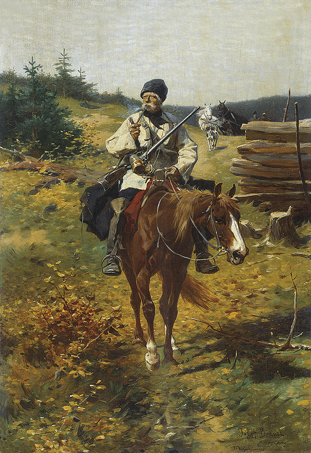 Józef Brandt (Szczebrzeszyn 1841 - Radom 1915) był jednym z najwybitniejszym polskich malarzy batalistów. Naukę malarstwa rozpoczął w Warszawie pod okiem Juliusza Kossaka. W latach 1858-1860 był w Paryżu, gdzie podjął studia inżynierskie. Niebawem zarzucił je jednak na rzecz malarstwa i kształcił się w pracowni Leona Cognieta. Po powrocie do kraju, w 1861 debiutował na wystawie w warszawskim TZSP. Od 1863 kontynuował studia w monachijskiej ASP u Franza Adama. W 1870 otworzył w Monachium własną pracownie i niebawem stał się przywódcą, „generałem” tamtejszej polskiej kolonii artystycznej i nauczycielem wielu malarzy. Po 1877 miesiące letnie spędzał w Orońsku, zapraszając na plenery grono swych uczniów. Został honorowym profesorem Akademii w Monachium (1878), członkiem Akademii w Berlinie (1877) i Pradze (1900). Odznaczony wysokimi orderami, wyróżniany medalami i nagrodami na międzynarodowych wystawach, cieszył się prawdziwie europejską sławą. Mieszkając i tworząc poza krajem zawsze wyraźnie podkreślał swoją polskość; dając jej wyraz choćby poprzez podpisywanie obrazów Józef Brandt z Warszawy. Malował bitwy, potyczki, podjazdy – epizody z historii polskich wojen kresowych i wojen szwedzkich XVII wieku, a także sceny rodzajowe – jeźdźców, polowania, jarmarki. Jego barwne, pełne ruchu i perfekcyjne warsztatowo obrazy podziwiano powszechnie, jako najlepszy przykład wysoko wówczas cenionej „szkoły polskiej”. Ale podczas gdy niemiecki czy francuski widz dostrzegał w nich przede wszystkim egzotykę i barwy Orientu, dla Polaków były to płótna „prawdziwe, naturalne, swojskie jak fragmenty z pamiętników Paska albo Rzewuskiego, przetransponowane na barwy i linie”. |