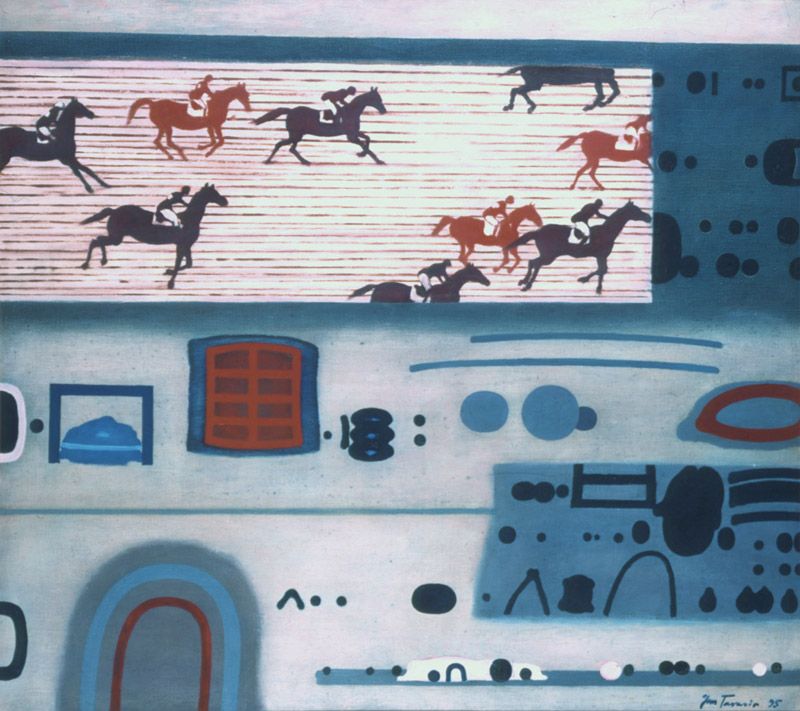 Jan Tarasin (Kalisz 11 IX 1926 - Warszawa 8 VIII 2009) studiował malarstwo w ASP w Krakowie pod kierunkiem prof. Zbigniewa Pronaszki (1946-1951). Jeszcze jako student zadebiutował na I Wystawie Sztuki Nowoczesnej w Krakowie w 1948/49. W połowie lat 50. stworzył cykle litografii: „Nowa Huta i jej mieszkańcy“, 1954, „Dom“, 1955). W pierwszym przeciwstawił się oficjalnemu optymizmowi, w drugim, operując symboliką martwej natury, zawarł treści egzystencjalne i odnoszące do niedawnego dramatu wojny. Po 1956 zaczął malować obrazy niefiguratywne. Układy wyodrębnionych elementów (określanych jako „przedmioty“) umieszczane były przez artystę na płaszczyźnie (cykl „Wnętrze“, 1957) ), lub w aluzyjnej przestrzeni (cykle „Uczta“, 1957, „Brzeg“, 1962-1964, „Przedmioty policzone“, od 1968, „Antykwariat“, 1968). Zasada ta utrzymuje się w jego malarstwie w następnych latach, różnice między okresami twórczości dotyczą sposobu opracowania „przedmiotów“ i ich usytuowania w przestrzeni obrazu lub wobec tła. Od lat 70. „przedmioty“ zmieniają się w graficzne, zwykle czarne znaki na jasnych tłach (cykl „Kolekcja“, od 1971). Tła z kolei bywają iluzyjnie przestrzenne, zróżnicowane walorowo, miękkie. W latach 90. artysta wrócił do kolorystycznego, bardziej malarskiego rozwiązywania zarówno znaków, jak i teł, często ciemnych lub przenikających się z „przedmiotami“ (cykl „Wylęgarnia przedmiotów“, 1992). Tarasin od 1962 jest członkiem „Grupy Krakowskiej“. W 1963-67 uczył na Wydziale Architektury Wnętrz krakowskiej ASP. W 1967 przeniósł się do Warszawy, w 1974 podjął pracę pedagogiczną na Wydziale Malarstwa ASP w Warszawie. W 1987-90 był rektorem tej uczelni. W 1976 otrzymał Nagrodę Krytyki Artystycznej im. Cypriana Kamila Norwida, w 1984 Nagrodę im. Jana Cybisa.; Nagroda na MB Sztuki w San Marino 1965. Równolegle z malarstwem zajmował się rysunkiem i grafiką - do lat 60. litografią, od 1974 serigrafią. W 1974-1981 wydał 8 autorskich „Zeszytów“ z serigrafiami i własnymi tekstami. W 1995 w Galerii Zachęta odbyła się wystawa artysty, której towarzyszył monograficzny katalog.